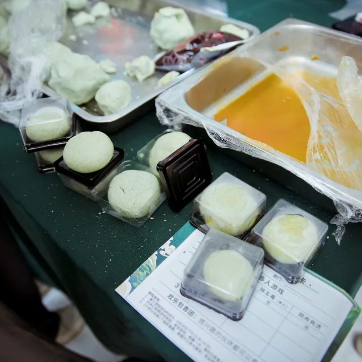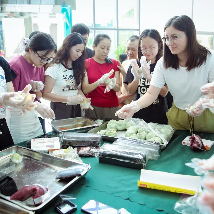 游戲區歡樂聲連連,美味制造區同樣其樂融融。嫩綠的糯米團散發著淡淡的艾草香,豐富的餡料區讓人陷入“選擇焦慮癥”,只見在飯堂阿姨的指揮下,面團在每個人的手中經過揉捏后,變成一個個圓圓的、可愛的“綠寶石”。