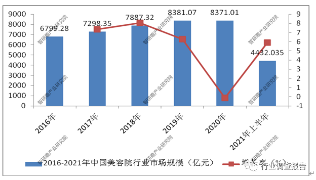 美容經濟是中國經濟的重要組成部分,近些年來,行業發展迅速,2020年美業資產已經增長至1800多億美元,2016-2021年中國美容院行業市場規模平穩上升。2016-2021年中國美容院行業市場規模增長率在8%左右,2020年中國美容院行業市場規模8371.01億元,同比增長-0.12%。2016-2021年中國美容院行業市場規模預測如下: